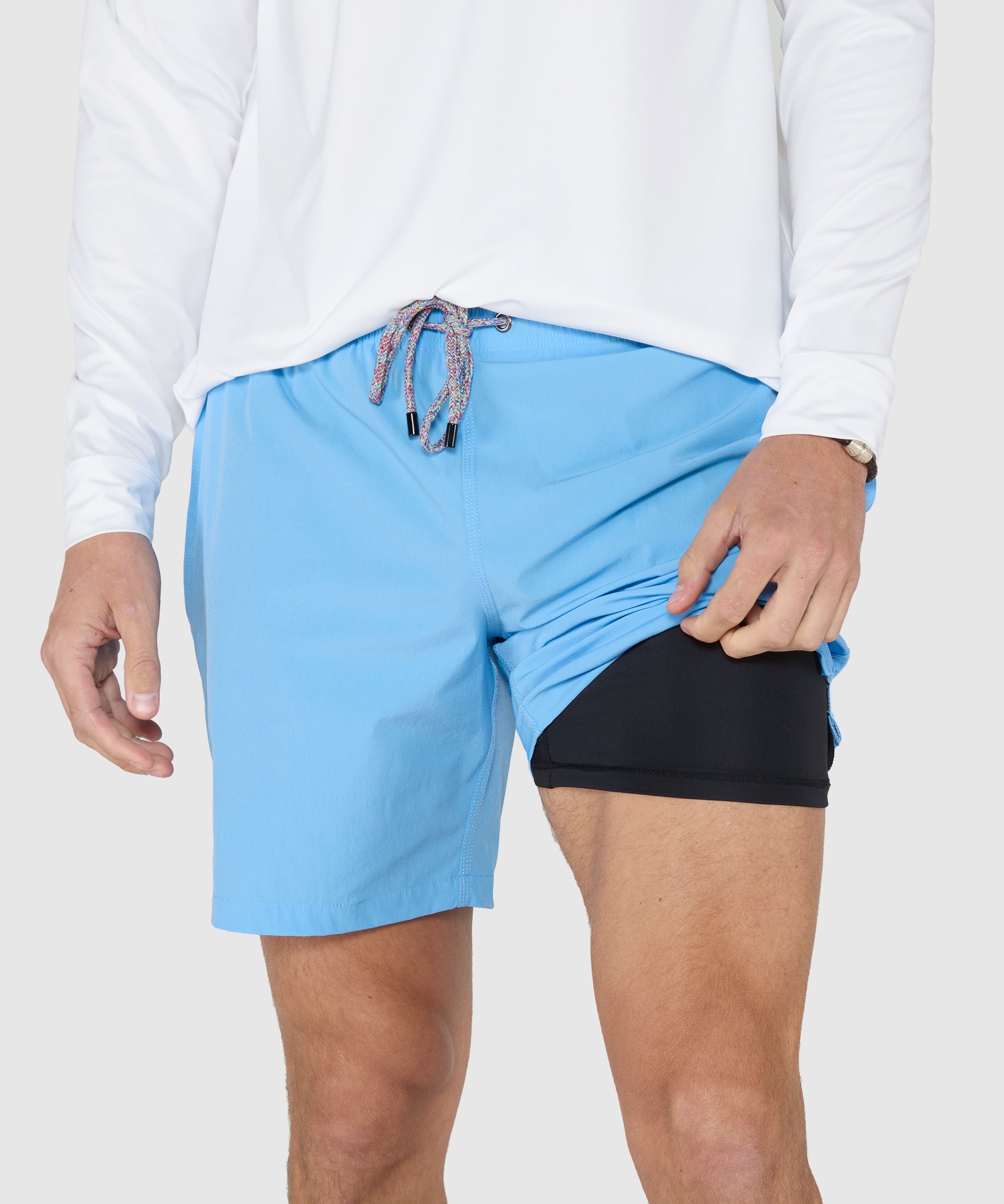 1) slightly elastic fabric eliminates binding 2) fit in the waist is fully adjustable with both a draw string and 360 degree elastic 3) high quality inner liner. My two other nearly new swim trunks are now retired.