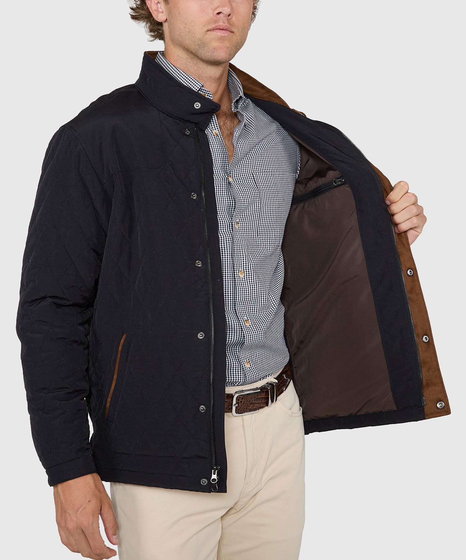This big and tall jacket's look has its origin in traditional outdoorsman sportswear. It gets an update with a more modern performance fabrication that enhances the elements of comfort and mobility while on the go. It features an elegantly quilted exterior capped off with its namesake shooter shoulder patches. Suedette detailing adds accent to the side pockets and collar interior. It may have countryside beginnings but its elevated ruggedness is at home just about anywhere.