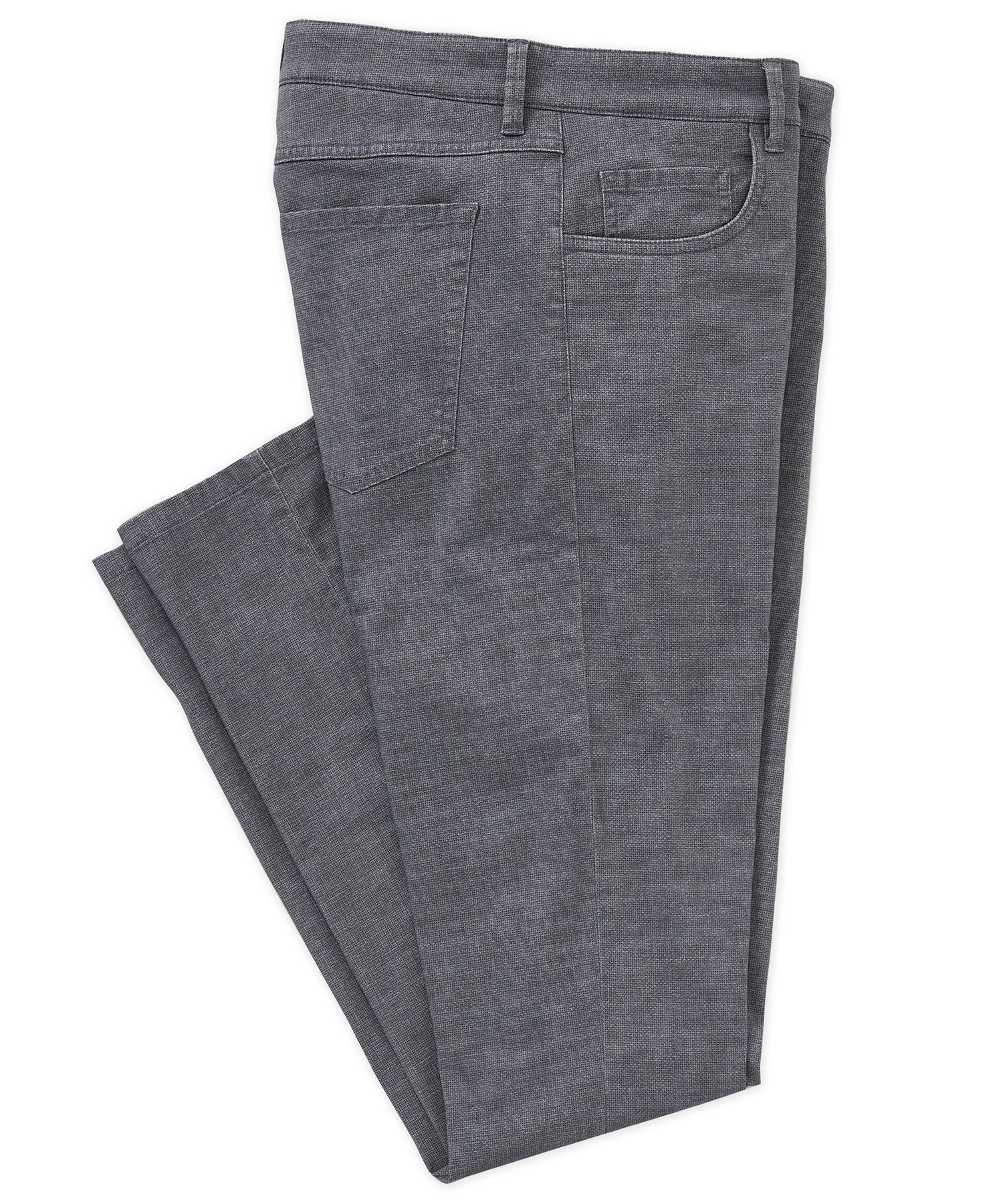 A reliable, jeans-inspired pair of pants is a must for any season. It's often times the first pair all of us go to for everyday wear. Since it's so essential it makes sense that it should also be as comfortable as possible. That's what you'll find in this five-pocket pant from Westport Black. It's made from a cotton-rich blend containing modern performance fabrics. As a result it conveys an element of stretch and makes for the best overall fit with added mobility. It also has soft hand feel.. It hits all the style points of your favorite jeans with scoop front and rear patch pockets. A shank button and zipper fly opening finish the classic construction. What's more is that is features a subtle "dog bone" pattern. It gives the pants a slightly textured look; making them just a cut above your average pair.