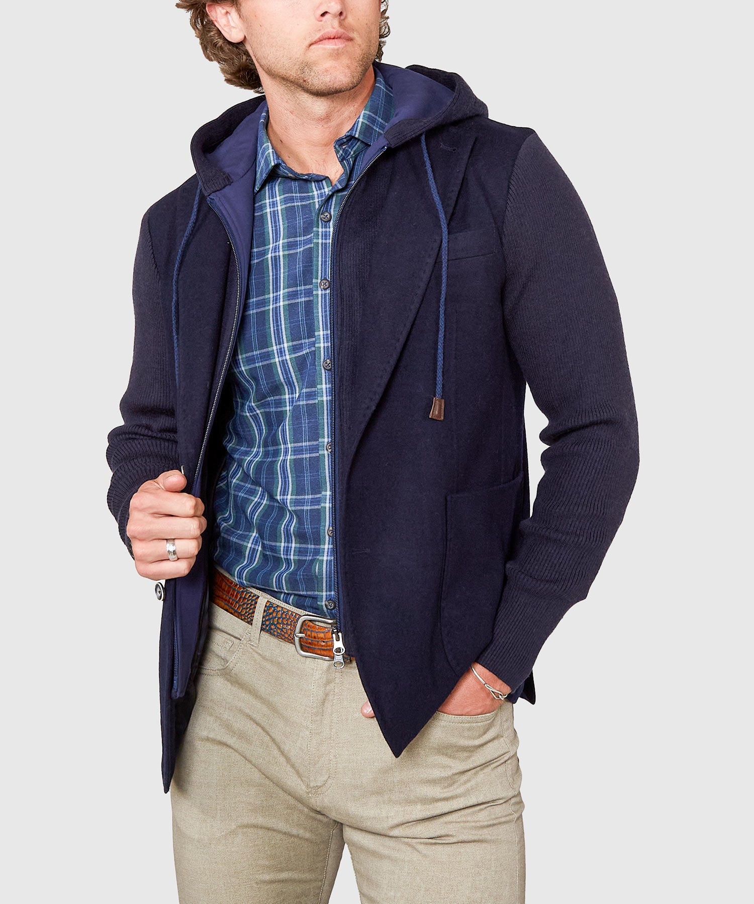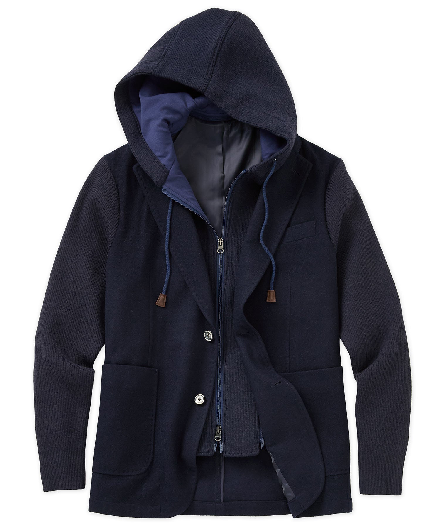 This is a unique piece to say the least. It's a modern take on dressing up, proving that comfort doesn't have to be the enemy of style. In fact, this big and tall hybrid garment offers a perfect blend of dress and casual. It's a legit wool blazer, complete with open patch pockets and two-button styling. It's also a hoodie with a full zip front and drawcord; and it's removable. It's not hard to imagine wearing this in many situations.