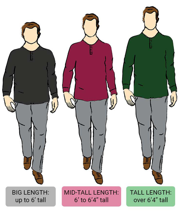 Note that torso length will affect where the shirt falls, so a longer torso might need a size Tall even if height is less than 6'4", and a shorter torso might need a size Mid-Tall even if height is above 6'4".