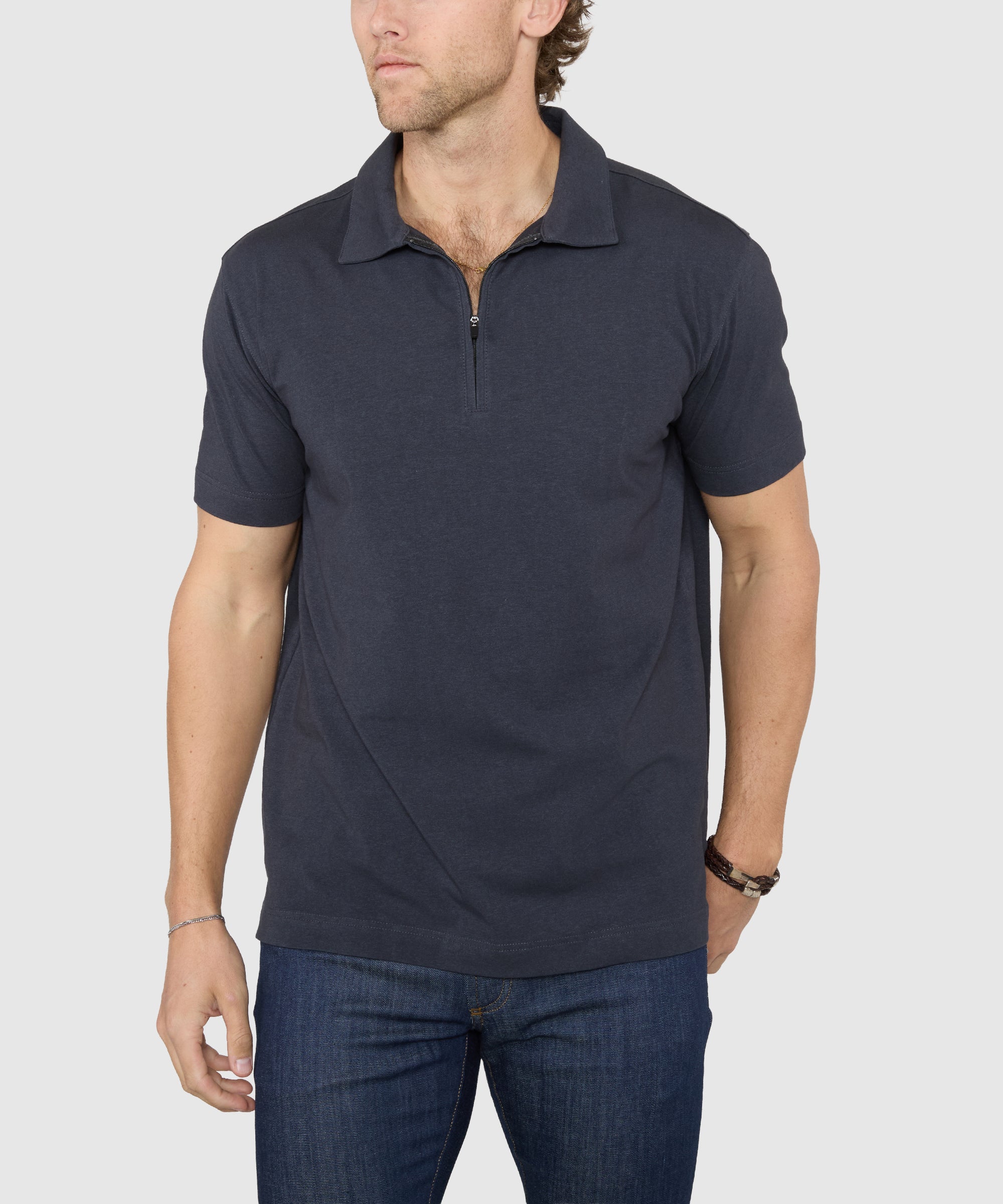Our Westport No-Tuck brand began with the mission of bringing our customers the best in the burgeoning untucked market. Unlike some, we implicitly knew that one untucked length would not fit all. Armed with that knowledge, we created three distinct lengths to offer the perfect fit for customers of different heights. It also all began with sport shirts being the main focus. In the ensuing seasons, we expanded this line to include classic, tried-and-true knit pieces. These would be no-tuck versions of indispensable shirts that everyone has in their wardrobe. They also would be made from the best modern fabrics that ensure both comfort and performance. What’s more essential this time of year than the good old polo? This No-Tuck version is not the ordinary golf shirt, though. It’s a standout due to its up-to-date cotton and performance blend fabrication. It adds stretch without sacrificing any of the soft cotton feel. Ideal for any casual outfit, its perfect length gives you a clean silhouette. In an attempt to up the style ante, this polo trades the button collar in for a zip closure. Of course, it also comes in our three lengths. As with our other No-Tuck products, we recommend big sizes up to 6', mid-tall sizes from 6'1" to 6'4", and tall sizes for men taller than 6'4". It’s great on its own and definitely layered over a T-shirt.