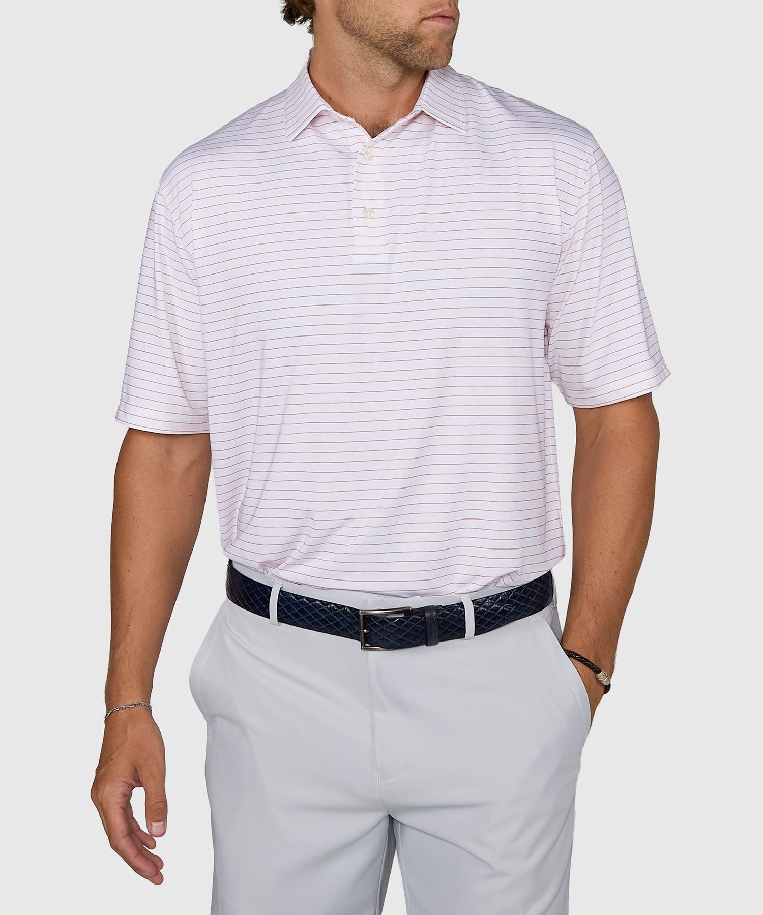 The polo-styled knit shirt has been a long-standing foundational piece of menswear for generations, and with good reason. They’re versatile, accessible, and basic without looking boring. They are also a malleable platform for alteration in their composition and styling. All kinds of materials have been used to make these. Everything from all cotton to blends to more modern-day performance fabrics have played a role in updating and expanding on the wearability of this garment. Likewise, they have come in all kinds of silhouettes: buttons, no buttons, cuffed sleeves, sleeves without cuffs, etc. Each iteration has brought a new dimension to it. This Westport Lifestyle exclusive is crafted from premium performance materials and stretch comfort and mobility to a shirt that takes its place in the pantheon of summer classics.