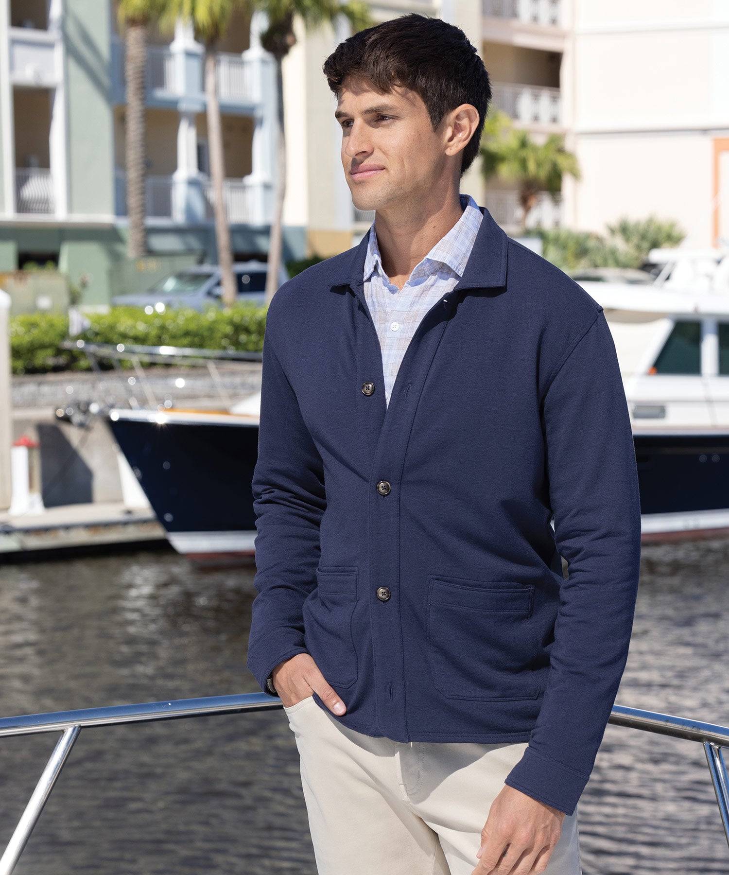 It's not quite a sport coat, and it's not quite an outerwear piece. The modern chore coat exists in between and has its origins in 19th-century France. It still comes in the more classic, midweight, rugged, work-approved version. This one, however, eschews the traditional approach in favor of a more contemporary take. It's decidedly more lightweight and elevated with its blend of cotton and performance fabrics. As a result, it has stretch, yielding a greater sense of comfort and mobility. Wear it like a more casualized blazer. It lends a smart finish to knits and wovens alike. Pair it all with a seasonal five-pocket or chino. It's a sleek addition to any wardrobe and will get more than a few double takes.