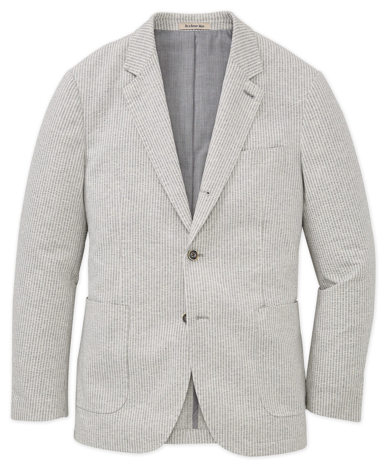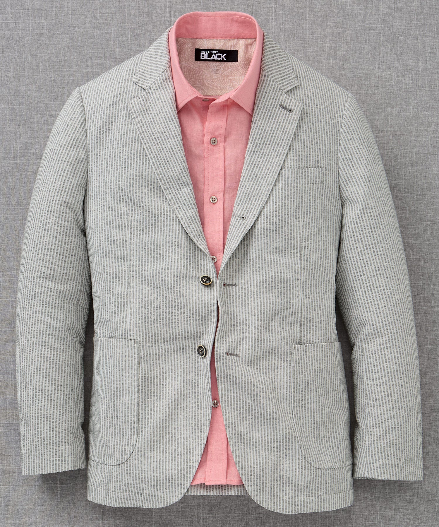 The popularity of softly constructed sport coats (or soft coats) has skyrocketed over the past few years. They go hand-in-hand with the casualization of dress we've all seen recently—and with good reason. They are an ideal garment to have at the ready in the ever-quickening environments in which one may find themselves. This big and tall one from Westport Black is comprised of premium cotton. It bears the unique stripe pattern of that springtime favorite fabric—seersucker. It looks and functions like any great sport coat, only its knit construction means it's even softer and more flexible. It's made for the road too—easily packed up and ready to join you on work trips or out-of-town events. Traditionally styled, it has a two-button silhouette, notch lapels, and side vents.