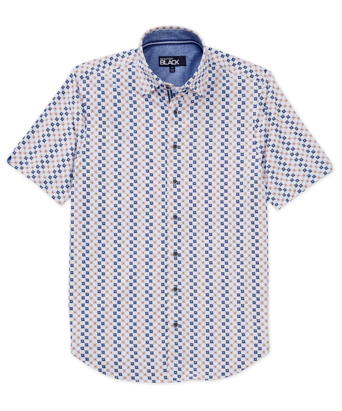 Make a stylish statement this spring with a printed sport shirt. It's a little break from the norm and a great way to stand out from the crowd. This one is sure to keep you comfortable in addition to looking your best. Premium cotton is paired with modern fibers to add a dimension of stretch-infused mobility. Custom contrast detailing at strategic points only serves to make this a sport shirt to take a second look at.